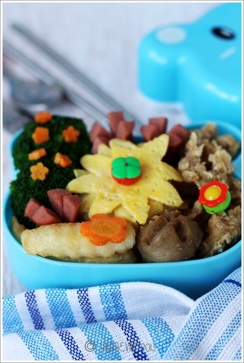 Jujur sejujur-jujurnya nih... aku ga pernah bikinin anakku nasi bekal yang di bento-bento'in kayak gini karena 2 ndoro putriku itu emang ga pernah minta, bawa bekal ke sekolah pun juaraaang buanget karena disekolah udah dapat snack dan makan siang. Kalopun bawa itu karena ada acara outing ato renang daaaaaaann ga pernah dibentuk aneh-aneh gitu, yo wis brak-bruk di luncbox, hihiiii.... makanya ketika temen-temen sibuk pada beli buku bento aku anteng-anteng ae :D