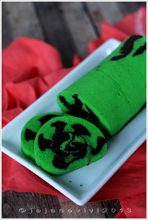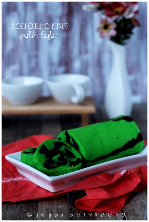 Critanya mbak Lulus ngajakin aku untuk belajar bikin kue, jenis kuenya mbak Lulus yang nentuin dan salah satunya bolu gulung ini. Sejak bisa bikin kue baru kali ini bikin bolu gulung kukus yang pake putih telur semua, udah gitu putih telurnya dingin pula...bener-bener dingin...lha wong pas mo dikocok tuh masih beku. Jujur aku khawatir ga jadi aza..hihiii dan ternyata waktu dikocok bisa mengembang sempurna. Selanjutnya...bikin motifnya tuh, pengennya sih sama seperti yang digambar buku tapi ternyata kami kurang sabar, hikz...akhirnya dengan kesepakanan kami berdasarkan ketidaksabaran itu (bahasa yang aneh, hahaa) sisa adonan hijau dituang begitu aza diatasnya. Ketika udah matengpun bikin aku ketar-ketir karena hasilnya tebel banget boooo...khawatir ga bisa digulung, tapi alhamdulillah bisa tergulung rapi. Daaaan...hasilnya silahkan diliat di foto itu...hihiiii